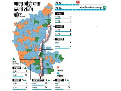 मतदारांना भावली भारत जोडो यात्रा काँग्रेसचे नेते राहुल गांधी यांची भारत जोडो यात्रा कर्नाटकमध्ये २१ दिवस होती. तिचा प्रवास झालेल्या सात जिल्ह्यांमध्ये ४८ विधानसभा जागा आहेत. त्यातील ३२ जागा नुकत्याच झालेल्या विधानसभा निवडणुकांत काँग्रेसने जिंकल्या. म्हणजे काँग्रेसचा तेथील स्ट्राइक रेट ६६ टक्के आहे. २०१८च्या विधानसभा निवडणुकांत या सात जिल्ह्यांमध्ये काँग्रेसने फक्त १५ तर भाजपने १७ जागा जिंकल्या होत्या. पण, यंदा काँग्रेसने हे सर्व जिल्हे काबीज केले आहेत.