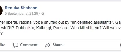 जितेंद्रने ‘इतनी आवाजें अनगिनत इच्छाएँ, पल पल का बैर घड़ी घड़ी का बखेड़ा’ ही स्वलिखित कविता फेसबूक अकाऊंटवर शेअर करत समाजातील सद्यस्थिती चे समर्पक वर्णन केले आहे. अभिनेत्री रेणुका शहाणे यांनीही ‘आणखी एका पुरोगामी आवाजाचा अज्ञातांकडून अंत’ अशा शब्दांत फेसबूकवर संताप व्यक्त केला आहे. गौरी लंकेश यांच्या आत्म्यास शांती लाभो! दाभोलकर, पानसरे, कलबुर्गी यांची हत्या कोणी केली? आपल्याला कधी तरी हे कळणार का? असा प्रश्नही त्यांनी उपस्थित केला आहे.