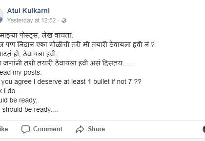 अभिनेता अतुल कुलकर्णी यांनी ‘तुम्ही माझ्या पोस्ट्स, लेख वाचता. सात नसेल पण निदान एका गोळीची तरी मी तयारी ठेवायला हवी नं ? मला वाटतं हो, ठेवायला हवी. ब-याच जणांनी तशी तयारी ठेवायला हवी असं दिसतंय...’ अशा शब्दांत लंकेश यांच्या हत्येबाबत फेसबूकवर मराठी आणि इंग्रजीत तीव्र आक्षेप नोंदवला आहे. स्वत:चे विचार परखडपणे मांडणा-यांचा जीव आता सुरक्षित नाही, त्यांची जीवनयात्रा संपवण्याचा प्रयत्न केला जात आहे, तरी आपण बोलत रहायला हवे, या विचारांना अनेकांनी पाठिंबा दर्शवला आहे. अनेकजणांनी ही पोस्ट शेअर केली असून खूपजणांनी याबाबत निर्भिडपणे आपल्या प्रतिक्रियाही नोंदवल्या आहेत.