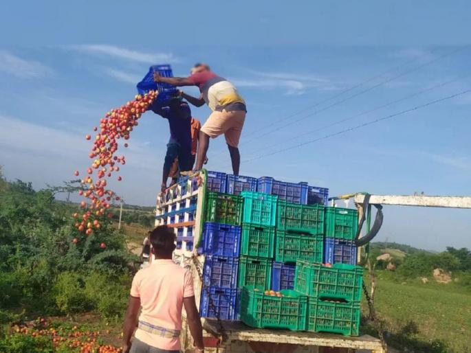 दरम्यान, टोमॅटोला योग्य भाव मिळत नसल्याचा आरोप शेतकऱ्यांनी केला आहे. टोमॅटो बाजारात नेणे देखील शक्य होत नसल्याने शेतकरी टोमॅटो रस्त्यावर टाकून देत आहे. आंध्र प्रदेशातील कुरनूल जिल्ह्यातील पत्तीकोंडा या घाऊक बाजारात एक किलो टोमॅटोची किंमत फक्त ३ रुपये किंवा २ रुपये आहे. तर, १०० किलो टोमॅटोचा भाव केवळ २०० रुपये आहे.