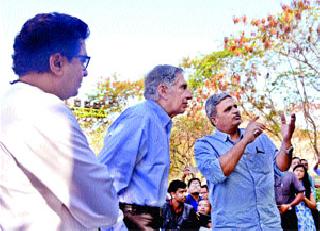 नाशिक : एका आगळ्यावेगळ्या इको फ्रेन्डली संकल्पनेतून ‘बॉटनिकल गार्डन’च्या रूपाने एक नावीन्यपूर्ण प्रकल्प नाशिकला मिळाला. हा प्रकल्प निसर्गप्रेमींना निश्चित आकर्षित करणारा आहे, असे मत टाटा उद्योग समूहाचे अध्यक्ष रतन टाटा यांनी उद्यानाला दिलेल्या भेटीप्रसंगी व्यक्त केले. पांडवलेणीच्या जवळ असलेल्या पंडित जवाहरलाल नेहरू वनोद्यानाचा विकास करून टाटा ट्रस्टच्या सहकार्याने साकारण्यात आलेल्या ‘बॉटनिकल गार्डन’ला रतन टाटा यांनी राज ठाकरे यांच्यासमवेत सोमवारी (दि. ३०) भेट दिली. यावेळी त्यांनी उद्यानात इको फ्रेण्डली वाहनातून फेरफटका मारत विकासकामांची पाहणी केली. सकाळी साडेनऊ वाजेच्या सुमारास टाटा यांचे उद्यानात आगमन झाले. फुलपाखरूच्या आकारामध्ये तयार करण्यात आलेले उद्यानाचे आकर्षक प्रवेशद्वार पाहून टाटा यांनी आनंद व्यक्त केला. ठाकरे व टाटा यांनी येथील बालोद्यान कक्षामध्ये उभारण्यात आलेल्या आशियाई व आफ्रिकन हत्तींच्या प्रतिकृती न्याहाळल्या. तेथून ‘कथा अरण्याची’ या संकल्पनेतून खुले नाट्यमंचाच्या ठिकाणी साकारण्यात आलेल्या लेझर शो-बोलक्या झाडांची पाहणी केली. यावेळी संबंधितांकडून रतन टाटा यांना सदर पर्यावरणपूरक निसर्ग संवर्धनासाठी प्रबोधनात्मक संकल्पना विशद करण्यात आली. यावेळी महापौर अशोक मुर्तडक, उपमहापौर गुरुमित बग्गा, स्थायी समितीचे सभापती सलीम शेख यांनी पुष्पगुच्छ देऊन टाटा यांचे नाशिककरांच्या वतीने स्वागत केले. वनविकास महामंडळ, टाटा ट्रस्ट व महापालिका यांच्या संयुक्त विद्यमाने नेहरू वनोद्यानाचा विकास साधला गेला आणि ‘बॉटनिकल गार्डन’ उभारण्यात आले. या प्रकल्प उभारणीला टाटा ट्रस्टने सीएसआर अंतर्गत निधी उपलब्ध करून देण्यात आला वो फायबर के पेड हैं...‘अभी हमने जो पेड देखें वो फायबर के हैं, और रात में ये बाते करते हैं...’ असा संवाद राज ठाकरे यांनी उद्यानातून बाहेर पडत असताना रतन टाटा यांच्याशी साधला. यावेळी टाटा यांनी मनमोकळे हसत त्यांना दाद दिली. ‘ये प्रोजेक्ट बहुतही बेहतर हैं और नासिक की बडी मिसाल कायम करेगा’ असे मत त्यांनी ठाकरे यांच्याशी फेरफटका मारताना व्यक्त के ले.