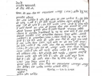 "बेटी बचाओ, बेटी पढाओ, सुकन्या समृद्धी योजना इत्यादी तुमच्या अनेक योजना आम्ही ऐकल्या आणि पाहिल्या आहेत. त्यामधून आम्हाला खूप प्रेरणा मिळाली आहे. आम्हालाही आमच्या पालकांसोबत राहून त्यांचं नाव खूप मोठं करायचं आहे. कृपया आमच्या पालकांची जगतपुरा, जयपूर येथे बदली करा. आम्ही तुमचे अत्यंत ऋणी राहू." मुलींनी यानंतर खाली त्यांची नावं लिहिली आहेत.