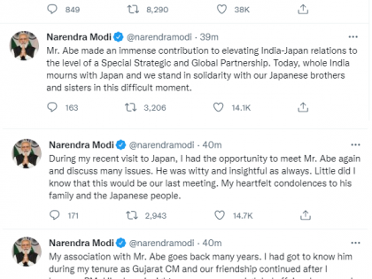 माझ्या नुकत्याच झालेल्या जपान भेटीत मला अबे यांना पुन्हा भेटण्याची आणि अनेक मुद्द्यांवर चर्चा करण्याची संधी मिळाली. ही आमची शेवटची भेट असेल, याचा मी विचारही केला नव्हता. शिंजो यांच्याबद्दल आदर व्यक्त करण्यासाठी उद्या दि. 9 जुलै 2022 रोजी मी एक दिवसाचा राष्ट्रीय दुखवटा जाहीर करतो.'