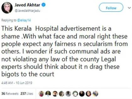 'केरळमधील रुग्णालयाची कृती लज्जास्पद आहे. ही माणसं कोणत्या तोंडानं आणि नैतिकतेनं धर्मनिरपेक्षता आणि न्यायाची मागणी करतात. अशा प्रकारच्या जाहिरातींनी कोणत्याही नियमांचं किंवा कायद्याचं उल्लंघन कसं होतं नाही याचं मला आश्चर्य वाटतं. कायदेतज्ज्ञांनी याबद्दल विचार करुन अशा कट्टरवाद्यांना न्यायालयात खेचायला हवं,' अशा शब्दांमध्ये अख्तर यांनी रुग्णालयाच्या जाहिरातीवर सडकून टीका केली.