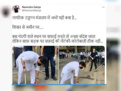 नागरी उड्ड्यानमंत्री ज्योतिर्रादित्य शिंदे यांनी त्यांच्या कार्यालयीन परिसरात झाडू हातात घेऊन स्वच्छता केली. तर, दोनच दिवसांपूर्वी बुऱ्हानपूर मतदारसंघात डान्स करतानाचा त्यांचा व्हिडिओ समोर आला होता. त्यामुळे, आता काँग्रेसने शिंदेंच्या या व्हिडिओवरुन टीका केली आहे. नरेंद्र सलूजा यांनी ट्विट करुन निशाणा साधला आहे. नागरी उड्डायान मंत्रालयात आता एवढंच राहिलं होतं, उंचीवरुन जमीनवर... अस्वच्छ जागेवर सफाई केली असती, तर चांगला संदेश गेला असता. मात्र, साफ-स्वच्छ रस्त्यावर स्वच्छतेचं नाटक, फोटोसेशन योग्य नाही, असे सलूजा यांनी ट्विटरवरुन म्हटलं आहे.