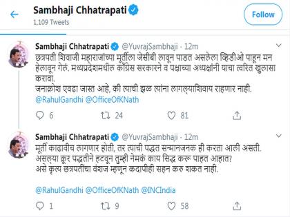 छत्रपती शिवाजी महाराजांच्या मूर्तीला जेसीबी लावून पाडत असलेला व्हिडीओ पाहून मन हेलावून गेलं. मध्य प्रदेशमधील काँग्रेस सरकारने व पक्षाच्या अध्यक्षांनी याचा त्वरित खुलासा करावा. जनाक्रोश एवढा जास्त आहे, की त्याची झळ त्यांना लागल्याशिवाय राहणार नाही, असा इशाराच संभाजीराजे छत्रपतींनी दिला आहे. मूर्ती काढावीच लागणार होती, तर त्याची पद्धत सन्मानजनक ही करता आली असती. असल्या क्रूर पद्धतीने हटवून तुम्ही नेमकं काय सिद्ध करू पाहत आहात? असे कृत्य छत्रपतींचा वंशज म्हणून कदापिही सहन करू शकत नसल्याचंही संभाजीराजेंनी अधोरेखित केलं आहे.