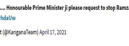 यानंतर कंगना रणौतने पंतप्रधान मोदींना आवाहन करत ट्विट केले होते, की 'माननीय पंतप्रधानजी, मी आपल्याला विनंती करते, की कुंभमेळ्यानंतर रमजानमध्ये होणाऱ्या मिलन समारंभांवरही निर्बंध घालण्यात यावेत.' मात्र काही वेळानंतर तिने हे ट्विट डिलिट केले.