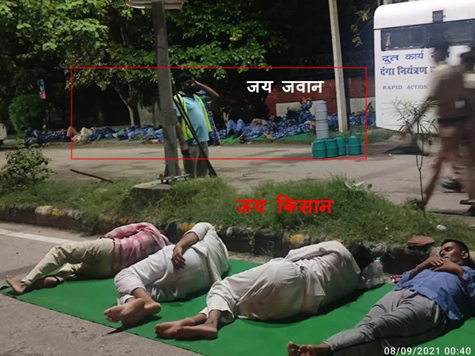 शेतकऱ्यांवर २८ ऑगस्टला बास्तारा येथील टोल नाक्याजवळ राष्ट्रीय महामार्ग रोखणाऱ्या शेतकऱ्यांवर पोलीसांनी लाठीमार केला होता. या घटनेच्या निषेधार्थ कर्नाल येथील सचिवालयाला घेराव टाकण्याचा इशारा दिला होता. त्यानंतर, शेतकऱ्यांनी मंगळवारी कर्नाल येथील सचिवालयाला घेराव घातला. यावेळी, रात्र रस्त्यावर झोपूनच काढली. शेतकऱ्यांसह सैन्य दलातील सुरक्षा जवानांनीही रस्त्यावरच पाठ मोकळी केली. अन्नदाता शेतकरी आणि देश रक्षणासाठी लढणारा जवान हे देशाचे महत्त्वाचे स्तंभ आहेत. मात्र, हे दोन्हीही रस्त्यावर झोपल्याचे एकाच छायाचित्रात कैद झाले. त्यांचा हा फोटो सध्या सोशल मीडियावर व्हायरल होत आहे. शेतकरी आंदोलनाचे अपडेट देणाऱ्या एका ट्विटर हँडलनेही हे फोटो शेअर केले आहेत.