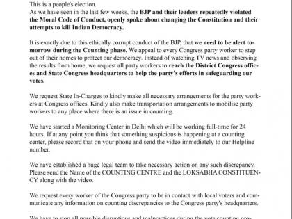 कार्यकर्त्यांना लिहिलेल्या पत्रात काँग्रेसने म्हटले की, ही जनतेची निवडणूक आहे. गेल्या काही आठवड्यांत भाजप आणि त्यांच्या नेत्यांनी वारंवार आचारसंहितेचे उल्लंघन केले आहे, संविधान बदलण्याचा आणि भारतीय लोकशाहीला उद्ध्वस्त करण्याचा प्रयत्न केला आहे. भाजपच्या या भ्रष्ट वर्तनामुळेच आम्ही काँग्रेसच्या प्रत्येक कार्यकर्त्याला मतमोजणीदरम्यान घराबाहेर पडण्याचे आवाहन करतआहोत.