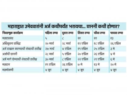 महाराष्ट्रात लोकसभेच्या ४८ जागांसाठी १९ आणि २६ एप्रिल, ७, १३ आणि २० मे अशा पाच टप्प्यांमध्ये मतदान होणार आहे. निवडणूक आयोगाने लोकसभा निवडणुकीसह आंध्र प्रदेश, ओडिशा, सिक्कीम व अरुणाचल प्रदेश या ४ राज्यांच्या विधानसभा आणि विविध राज्यांतील विधानसभेच्या २६ जागांसाठी पोटनिवडणुकीचा कार्यक्रम जाहीर केला.