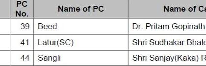 तर अहमदनगर लोकसभा मतदारसंघातून विद्यमान खासदार दिलीप गांधी यांचा पत्ता कट करत याठिकाणी नुकताच भाजपामध्ये प्रवेश केलेले डॉ. सुजय विखे पाटील यांनी संधी देण्यात आली आहे. तर लातूर लोकसभा मतदारसंघाचे खासदार सुनिल गायकवाड यांच्याऐवजी सुधाकरराव श्रृंगारे यांना उमेदवारी जाहीर झाली आहे.