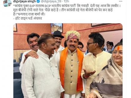यासोबतच इंदूरच्या आमदार मालिनी गौर सीएम मोहन यांच्या जवळ दिसत आहेत आणि त्यांच्या मागे सुदर्शन गुप्ता दिसत आहेत. हा फोटो शेअर करताना दिग्विजय सिंह यांनी लिहिलं आहे की, "मध्य प्रदेश काँग्रेसमुक्त करण्याचा दावा करणारी भारतीय जनता पार्टी काँग्रेसयुक्त झाली आहे. BJP आता BCP म्हणजेच भारतीय काँग्रेस पक्ष बनत आहे."