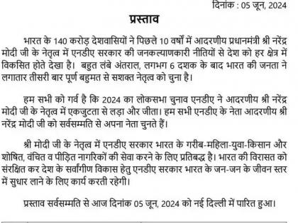 २०२४ ची लोकसभा निवडणूक नरेंद्र मोदी यांच्या नेतृत्वाखाली एकत्रित लढले आणि जिंकले याचा आम्हाला गर्व आहे. आम्ही सर्व एनडीएचे नेते म्हणून नरेंद्र मोदी यांनी सर्वसमंतीने निवड करत आहोत.