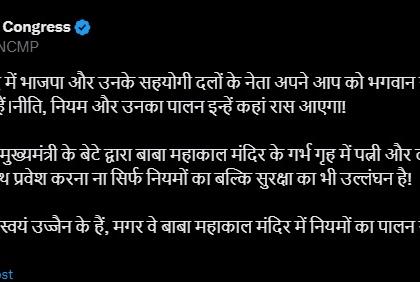 काँग्रेसने या प्रकरणावर जोरदार टीका केली आहे. सत्तेच्या नशेत बुडालेले भाजप आणि त्यांच्या मित्रपक्षांचे नेते स्वतःला देवापेक्षा मोठे समजत आहेत. महाराष्ट्राच्या मुख्यमंत्र्यांच्या मुलाने बाबा महाकाल मंदिराच्या गर्भगृहात पत्नी आणि अन्य दोन व्यक्तींसह प्रवेश करणे, हे नियमांचेच नव्हे, तर सुरक्षेचेही उल्लंघन आहे, अशी टीका मध्य प्रदेश काँग्रेसने केली. तसेच, काँग्रेसचे आमदार महेश परमार म्हणाले की, सर्वसामान्य भाविकांना दुरुनच दर्शन घ्यावे लागते, तर व्हीआयपी परवानगीशिवाय गर्भगृहात प्रवेश करतात. हे नियमांचे उल्लंघन तर आहेच, पण मंदिराच्या व्यवस्थेच्या विश्वासार्हतेवरही प्रश्नचिन्ह निर्माण करणारे आहे.