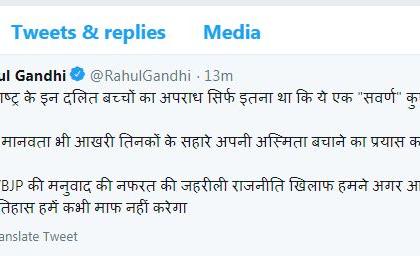 ''महाराष्ट्रातील या दलित मुलांचा गुन्हा केवळ इतका आहे की, त्यांनी 'सवर्ण' समाजाच्या विहिरीत आंघोळ केली. आरएसएस/ भाजपाच्या मनुवादाच्या विषारी राजकारणाविरोधात जर आपण आवाज उठवला नाही तर इतिहास आपल्याला कधीच माफ करणार नाही'', असे ट्विट राहुल गांधी यांनी केले आहे.