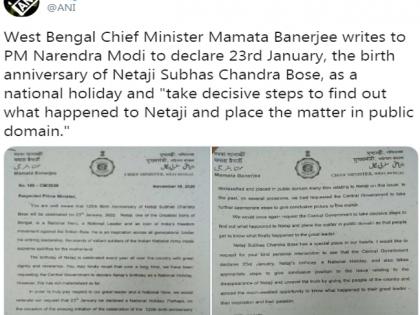 पश्चिम बंगालच्या मुख्यमंत्री ममत बॅनर्जी यांनी पंतप्रधान नरेंद्र मोदींनी पत्र लिहले आहे. त्यामध्ये आझाद हिंद सेनेचे संस्थापक आणि स्वातंत्र्य लढ्यातील अग्रगण्य सेनानी दिवंगत नेताजी सुभाष चंद्र बोस यांच्या जयंतीदिनी म्हणजेच 23 जानेवारी रोजी देशात राष्ट्रीय सुट्टी घोषित करावी