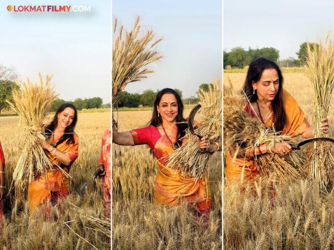 हेमा मालिनी यांनी आपल्या सोशल मीडिया अकाऊंटवर शेतात पिकांची कापणी करत असल्याचे काही फोटो शेअर केले आहेत. ज्यामध्ये त्या कांजीवरम साडी नेसून, पदर खोचून भर उन्हात दुपारच्या वेळी शेतकऱ्यांसोबत दिसतात. अचानक हेमा मालिनी यांना पाहून शेतकरी महिला देखील आश्चर्यचकित झाल्या. त्यांना सुखद धक्का मिळाला.