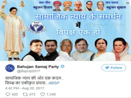 मात्र बहुजन समाज पक्षाचे राष्ट्रीय महासचिव एस. सी. मिश्रा यांनी सांगितलं की, फोटो शेअर करण्यात आलेलं ट्विटर अकाऊंट हे बहुजन समाज पक्षाचं अधिकृत अकाऊंट नाही. खरंतर 2014च्या देशातील परिवर्तनानंतर राजनैतिक घडामोडींना वेग आला आहे. भाजपानं आतापर्यंत अनेक राज्यांत सत्ता स्थापन केली आहे. तसेच राजकारणातही भाजपाचा प्रभाव दिवसेंदिवस वाढत असल्यानं विरोधी पक्षांसाठी स्वतःचं अस्तित्व टिकवणं मोठं आव्हान आहे. त्यामुळेच विरोधी पक्ष स्वतःमधील मतभेद विसरून एकत्र येण्याचं अपील करत आहेत. बहुजन समाज पक्ष हा कधीही युती करण्यापासून टाळाटाळ करत आला आहे. मात्र आता ट्विटरच्या माध्यमातून फोटो शेअर करत बहुजन समाज पक्षानं सामाजिक हितासाठी अखिलेश यादवपासून सोनिया गांधींपर्यंत सर्वांना एकत्र येण्याचं आवाहन केलं आहे. बहुजन समाज पक्षानं शेअर केलेल्या फोटोमध्ये काँग्रेस अध्यक्ष सोनिया गांधी, जेडीयू नेते शरद यादव, आरजेडीचे नेते लालूप्रसाद यादव, तेजस्वी यादव, पश्चिम बंगालच्या मुख्यमंत्री ममता बॅनर्जी यांच्यासह अखिलेश यादवांचाही समावेश आहे. या सर्व नेत्यांमध्ये मायावतींचा फोटो सर्वात मोठा दाखवण्यात आला आहे. मायावती उत्तर प्रदेशमध्ये समाजवादी पार्टीला सर्वात मोठा शत्रू मानते.
