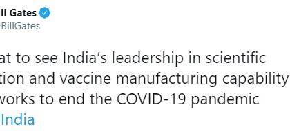 देशातील कोरोनाबाधितांची संख्या कमी होत असली तर धोका अद्यापही टळलेला नाही. अशा परिस्थितीत दोन दिवसांपूर्वी भारतानंभारत बायोटेकच्या कोवॅक्सिन आणि सीरम इन्स्टिट्यूट ऑफ इंडियाच्या कोविशिल्ड या लसींच्या आपात्कालिन वापरांसाठी परवानगी दिली. भारताच्या या निर्णयानंतर मायक्रोसॉफ्टचे सह-संस्थापक बिल गेट्स यांनी भारताच्या लस निर्मितीतील भारताच्या नेतृत्वाचं, वैज्ञानिकांच्या कामगिरीचं आणि कोरोना प्रतिबंधात्मक लसीच्या उत्पादनाच्या क्षमतेचं कौतुक केलं आहे.