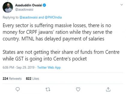 असुदुद्दीन ओवेसी म्हणाले की, प्रत्येक क्षेत्रात देशाचे मोठ्या प्रमाणात नुकसान होत आहे. मोदी सरकारकडे सीआरपीएफ जवानांच्या रेशनसाठीही पैसे नाहीत. तसेच एमटीएनएलने देखील कामगारांना पगार देण्यात उशीर करत असल्याचे देखील त्यांनी सांगितले. त्याचप्रमाणे मोदी सरकारने मार्चपासून आरबीआयकडून 2 लाख 34 हजार कोटी रुपये घेतले असून आतापर्यत कोण्यातही सरकारने एका वर्षात 50 कोटी रुपये घेतले नसल्याचे सांगत मोदी सरकारवर टीका केली आहे.