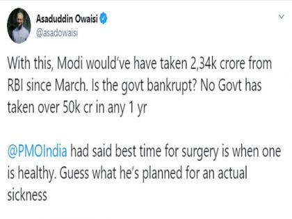 नवी दिल्ली: मोदी सरकार रिझर्व्ह बँक ऑफ इंडियाकडून अंतरिम लाभांश मागण्याची शक्यता आहे. सरकार आरबीआयकडून ३० हजार कोटींचा लाभांश मागू शकतं. २०१९-२० मधील वित्तीय तूट एकूण जीडीपीच्या ३.३ टक्के ठेवण्याचा सरकारचा प्रयत्न आहे. मात्र सध्याचं सरकारचं उत्पन्न पाहता वित्तीय तुटीचं लक्ष्य गाठणं अवघड दिसत आहे. त्यामुळे सरकार आरबीआयकडे लाभांश मागू शकतं, असं वृत्त एका इंग्रजी दैनिकाने दिलं होतं. मात्र यावर एमआयएम पक्षाचे अध्यक्ष असदुद्दीन ओवेसी यांनी ट्विट करत मोदी सरकारवर टीका केली आहे.