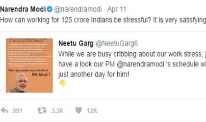 एका महिलेने पंतप्रधान नरेंद्र मोदींचं कौतुक करत त्यांना ट्विटरवर टॅग केलं होतं. ऑस्ट्रेलियाचे पंतप्रधान माल्कम टर्नबुल भारत दौ-यावर आले असताना त्यादिवशी पंतप्रधान नरेंद्र मोदींच्या दिवसभरातील कार्यक्रमांची यादी या महिलेने ट्विटरवर टाकली होती. त्यानुसार सकाळी पश्चिम बंगालच्या मुख्यमंत्री ममता बॅनर्जी यांना भेटण्यापासून ते एनडीएमधील मित्रपक्षांसोबत डीनर आणि मध्यरात्रीपर्यंत होणारी चर्चा असा एकूण कार्यक्रम होता.