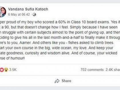 डिजिटल इंडियातील स्पर्धेच्या युगात सगळीकडेच स्पर्धा पाहायला मिळत आहे. मग, नोकरीसाठी असो किंवा उद्योगधंद्यांसाठी, अॅडमिशनसाठी असो किंवा स्कॉलरशीप मिळविण्यासाठी, जिथे तिथे स्पर्धाच स्पर्धा. स्पर्धेच्या या युगात दहावी आणि बारावीच्या परीक्षाही मागे नाहीत. त्यामुळेच, कधी काळी 60 टक्क्यांवर समाधान मानणारे पालक आज मुलांच्या 90 टक्के गुणांवरही तितकेसे आनंदी होत नाहीत. मात्र, दिल्लीतील एक आई यास अपवाद ठरली आहे. आपल्या एका हलक्याशा कृतीतून वंदना कटोच यांनी फेसबुकवरुन लाखो लोकांनी मने जिंकली आहेत. कारण, वंदना यांनी 60 टक्के गुण मिळविणाऱ्या आपल्या मुलाचे तोंडभरुन कौतुक या फेसबुक पोस्टमध्ये केले आहे.