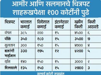 बॉक्स आॅफिस कलेक्शनच्या फुटफॉलचा आधार घेतल्यास साडेचार कोटी लोकांनी दंगल, चार कोटी लोकांनी सुल्तान व दोन कोटी लोकांनी रईस हा चित्रपट पाहिला आहे. देशभरातील वितरकांची आकडेवारी दैनिक भास्कर या वर्तमान पत्राने प्रसिद्ध केली आहे. आमिर खानने लोकप्रियतेसोबतच व्यवसायिक आकडेवारीमध्ये सलमान खान याला व त्याने शाहरुखला मागे टाकल्याचे दिसते. व्यवसायाचा आधार घेतल्यास शाहरुखला दोघांनी पछाडले आहे असे म्हणावे लागेल.