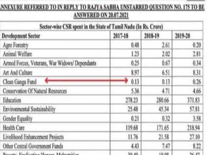 सरकारनं आकडेवारीसह दिलेला तपशीलदेखील खासदार विल्सन यांनी सोबत जोडला आहे. त्यात खर्च करण्यात आलेल्या सीएसआर निधीची माहिती आहे. आर्थिक वर्ष २०२० मध्ये ०.२६ कोटी म्हणजेच २६ लाख रुपये खर्च करण्यात आले आहेत. २०१८ आणि २०१९ या दोन वर्षात प्रत्येकी १३ लाख रुपये खर्च केले गेले आहेत. म्हणजेच तीन वर्षांत ५२ लाख रुपये खर्च करण्यात आले आहेत. विशेष म्हणजे तमिळनाडूतून गंगा नदी वाहतच नसताना ही रक्कम खर्च करण्यात आली आहे.