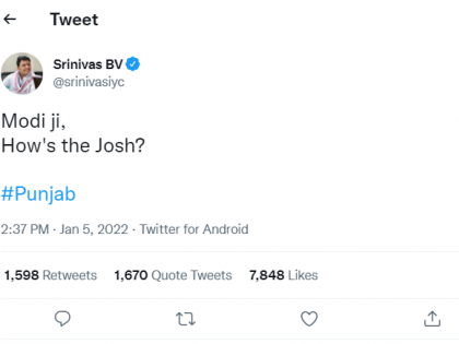 दरम्यान, काँग्रेस नेते श्रीनिवास बी. व्ही. यांनी ट्विट करुन मोदींवर हल्लाबोल केला होता. पंतप्रधान नरेंद्र मोदींची रॅली स्थगित झाल्यानंतर मोदींवर हल्लाबोल करत भाजपवर टीका केली होती. मोदीजी, हाऊज द जोश? असा प्रश्नार्थक सवाल श्रीनिवास यांनी विचारला होता.