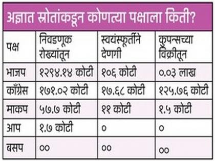 देणग्यांपैकी १८३२.८८ कोटी रुपयांचे स्रोत अज्ञात आहेत.