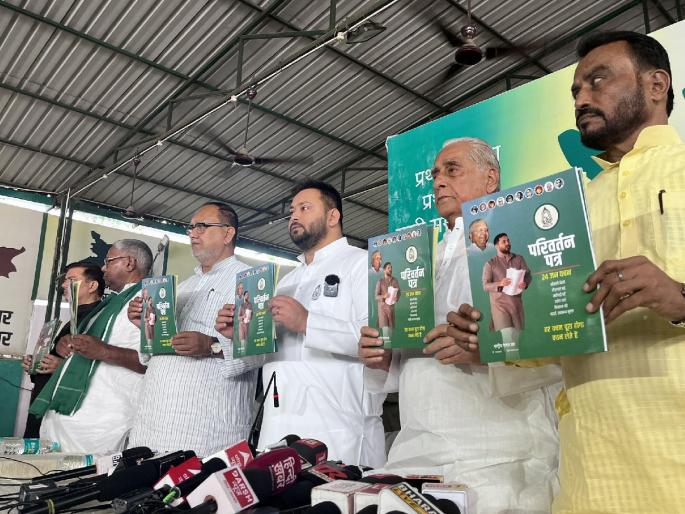 पाटणा: बिहारचे माजी उपमुख्यमंत्री आणि राष्ट्रीय जनता दलाचे (राजद) नेते तेजस्वी यादव यांनी शनिवारी लाेकसभा निवडणुकीसाठी पक्षाचा जाहीरनामा प्रसिद्ध केला. यात देशभरातील एक कोटी बेरोजगार तरुणांना सरकारी नोकऱ्या आणि राखीपौर्णिमेच्या दिवशी गरीब कुटुंबातील भगिनींना दरवर्षी एक लाख रुपये देण्याचे आश्वासन देण्यात आले आहे. केंद्रात ‘इंडिया’ आघाडीचे सरकार आल्यास ही आश्वासने पूर्ण करण्यात येतील, असे ते म्हणाले. ‘राजद’ने आपल्या जाहीरनाम्याला ‘परिवर्तन पत्र’ असे नाव दिले आहे. त्यात जनतेला एकूण २४ आश्वासने देण्यात आली आहेत.