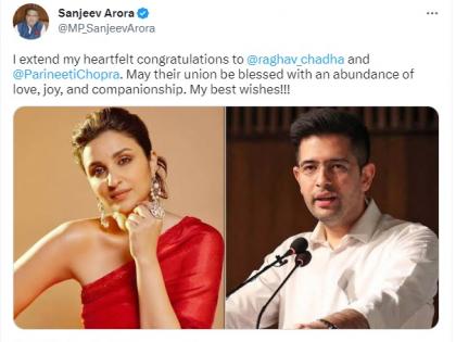 संजीव अरोरा यांनी आपल्या ट्विटमध्ये परिणीती आणि राघव चढ्ढा यांचा फोटो शेअर केला आहे. दोघांच्या फोटोसोबत त्यांनी कॅप्शनमध्ये लिहिले, मी राघव चढ्ढा आणि परिणीती चोप्रा यांचे मनापासून अभिनंदन करतो. मला आशा आहे की, दोघांचा सहवास प्रेम आणि आनंदाने भरलेला असेल. माझ्या शुभेच्छा!'