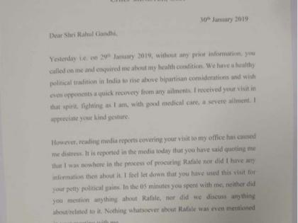 पर्रीकर यांनी या संबंधात राहुल यांना पत्रही लिहिले आहे. यामध्ये त्यांनी राहुल गांधी हे राजकीय लाभ मिळविण्यासाठीच आपल्याला भेटायला आल्याचा आरोप केला आहे. या पाच मिनिटांच्या बैठकीत नाही तुम्ही राफेल मुद्द्यावर बोलला नाही यासंबंधी चर्चा केली, असे म्हटले आहे.