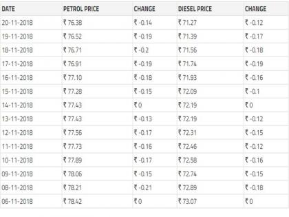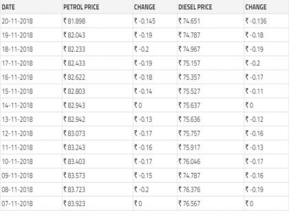 मागील दोन आठवड्यांपासून पेट्रोल आणि डिझेलच्या दरात सातत्यानं घट होत आहे. इंधनाची किंमत डॉलरचा दर व आंतरराष्ट्रीय बाजारातील कच्च्या तेलाचे भाव यावर निश्चित होते. दोन महिन्यांपासून कच्चे तेल महाग झाले होते. पण आता ते काही प्रमाणात स्वस्त झालं आहे. 6 ऑक्टोबरला पाच राज्यांमधील निवडणुकांच्या तारखा जाहीर झाल्या. निवडणुकांचा प्रचार ऐन रंगात असतानाच, तेल कंपन्यांनी 18 ऑक्टोबरपासून पेट्रोल-डिझेलची दरकपात सुरू केली आहे. यावरून सरकारी तेल कंपन्यांची निवडणुकांना डोळ्यासमोर ठेवून दरकपात केल्याचे दिसून येत आहे. निवडणुका संपताच डिसेंबरात इंधनाचे दर भडकण्याची भीती आहे.