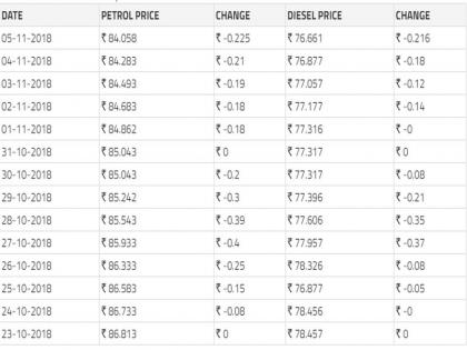 गेल्या काही दिवसांपासून पेट्रोल, डिझेलच्या दरांमध्ये घसरण होत आहे. इंधनाची किंमत डॉलरचा दर व आंतरराष्ट्रीय बाजारातील कच्च्या तेलाचे भाव यावर निश्चित होते. दोन महिन्यांपासून कच्चे तेल महाग झाले होते. पण आता ते काही प्रमाणात स्वस्त झालं आहे. 6 ऑक्टोबरला पाच राज्यांमधील निवडणुकांच्या तारखा जाहीर झाल्या. निवडणुकांचा प्रचार ऐन रंगात असतानाच, तेल कंपन्यांनी 18 ऑक्टोबरपासून पेट्रोल-डिझेलची दरकपात सुरू केली आहे. यावरून सरकारी तेल कंपन्यांची निवडणुकांना डोळ्यासमोर ठेवून दरकपात केल्याचे दिसून येत आहे. निवडणुका संपताच डिसेंबरात इंधनाचे दर भडकण्याची भीती आहे.