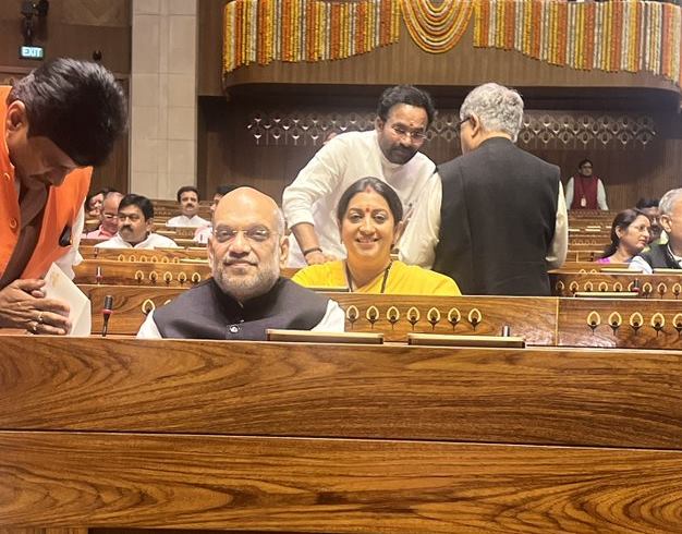 या फोटोत केंद्रीय गृहमंत्री अमित शहा आणि स्मृती इराणी एकाच फ्रेममध्ये दिसत आहेत. अमित शहांसमवेत नवीन संसद भवनातील पहिल्या काही रांगेत आणि अमित शहांसमवेत असल्याने स्मृती इराणींनी हा फोटो शेअर केला आहे. तसेच, ''फोटो बॉम्ब.. - जेव्हा प्रत्येकजण मेन फ्रेमचा हिस्सा बनू इच्छितो'', असे कॅप्शन इराणी यांनी या फोटोला दिलंय. या फोटोत स्मृती इराणींच्या पाठिमागे केंद्रीयमंत्री किनश रेड्डी हेही दिसून येतात.