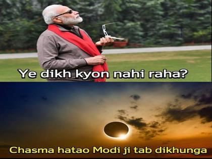 नरेंद्र मोदी यांच्या ट्विटला रिट्विट करत नेटकऱ्यांनी सूर्यग्रहण पाहातानाचा फोटो शेअर करुन तुमचा हा फोटो सोशल मीडियावर मीम्समध्ये वापराला जात असल्याचे सांगितले. यावर नरेंद्र मोदी यांनी देखील तुमचे आभार असल्याचे सांगत आनंद घ्या असं मिश्कील उत्तर दिलं.