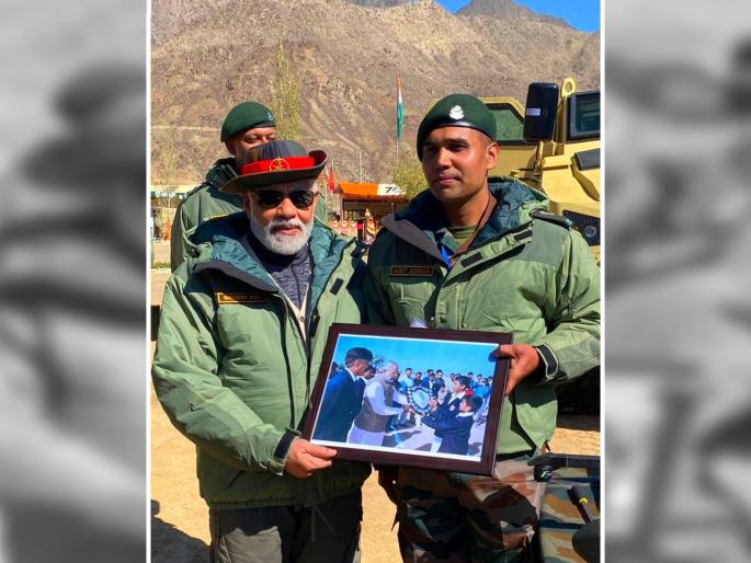 PM Modi Diwali in Kargil: पंतप्रधान नरेंद्र मोदी यांनी सोमवारी कारगिलमध्ये भारतीय लष्कराच्या जवानांसोबत दिवाळी साजरी केली. या दरम्यान एका तरुण लष्करी अधिकाऱ्याने पंतप्रधान मोदींना खास भेट दिली. ती भेट पाहून पंतप्रधान मोदीही भावूक झाल्याचे दिसून आले. पंतप्रधान नरेंद्र मोदी यांनी आज कारगिलमध्ये मेजर अमित यांची भेट घेतली. यावेळी मेजर अमित यांनी मोदींना अतिशय खास असा फोटो भेट दिला आणि साऱ्यांचेच मन जिंकले.