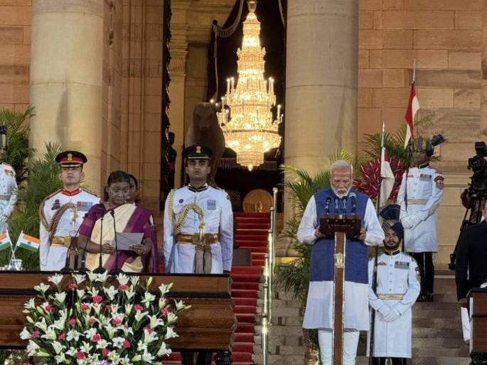 PM Modi Oath-Taking Ceremony ( Marathi News ) : आज नरेंद्र मोदी यांनी तिसऱ्यांदा पंतप्रधानपदाची शपथ घेतली आहे. त्यांच्यासह ६९ खासदार मंत्रिपदाची शपथ घेणार आहेत. दरम्यान, आज राष्ट्रपती भवनात पंतप्रधान नरेंद्र मोदी यांच्यानंतर भाजपा नेते राजनाथ सिंह यांनी कॅबिनेट मंत्रिपदाची शपथ घेतली आहे.
