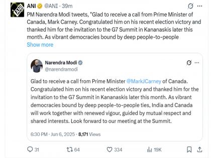 पंतप्रधान नरेंद्र मोदी म्हणाले की, कॅनडाचे पंतप्रधान मार्क जे कार्नी यांच्याशी फोनवरून संवाद साधून आनंद झाला. अलीकडेच कॅनडात झालेल्या निवडणुकीत कार्नी यांचा विजय झाल्याबाबत त्यांचे अभिनंदन केले. त्याशिवाय या महिन्याच्या अखेरीस कनानस्किस इथं होणाऱ्या जी ७ शिखर संमेलनात आमंत्रित करण्यासाठी त्यांचे आभार मानले. भारत आणि कॅनडा यांच्यात जिवंत लोकशाही आणि लोकांशी संबंध आहेत. परस्पर आदर आणि सामायिक हितसंबंधांवर आधारित नवीन उर्जेने एकत्र काम करू असं त्यांनी सांगितले.