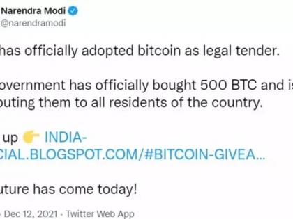 "भारताने अधिकृतपणे बिटकॉईनला कायदेशीर मान्यता दिली आहे आणि सरकार 500 बीटीसी विकत घेत आहे आणि लोकांमध्ये वितरित करत आहे" असं ट्विट हे अकाऊंट हॅक केल्यानंतर करण्यात आलं होतं. काही युजर्स सुरक्षा व्यवस्थेवरही प्रश्नचिन्ह उपस्थित करत आहेत. हे ट्विट आता हँडलवरून हटवलं गेलं असलं तरी काही युजर्सनी त्याचे स्क्रीनशॉट शेअर केले आहेत.