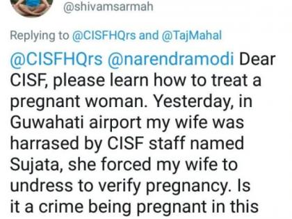 ही घटना 24 जूनला गुवाहाटी येथील गोपीनाथ बोर्डोलोई आंतरराष्ट्रीय विमातळावर घडली. गर्भवती महिला गुवाहटीहून दिल्लीला येत होती. दरम्यान, शिवम सरमाह यांच्या ट्विटनंतर सीआयएसएफने या घटनेची चौकशी सुरु केली आहे.