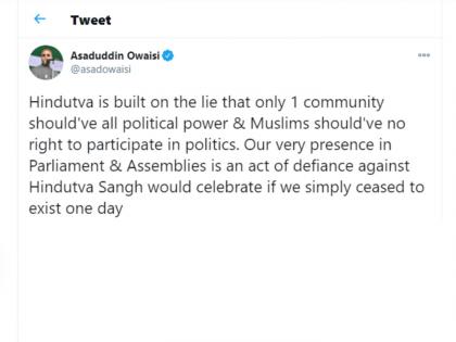 ओवेसी यांनी एक ट्विट केलं आहे. त्यात त्यांनी राष्ट्रीय स्वयंसेवक संघावर टीकेची झोड उठवली आहे. 'केवळ एका समाजाकडे राजकीय शक्ती एकवटली जावी आणि मुस्लिमांना राजकारणात सहभागी होण्याचा कोणताही अधिकार असू नये या खोट्या मुद्द्यावर संघाचे हिंदुत्व आधारलेलं आहे. खोट्या हिंदुत्ववादी संघाच्या विरोधात आव्हान उभारण्याचं काम संसद आणि विधानसभांमध्ये मुस्लिम समाजाच्या प्रतिनिधींच्या जास्तीत जास्त उपस्थितीतून होईल', या आशयाचं ट्विट असदुद्दीन ओवेसी यांनी केलं आहे.
