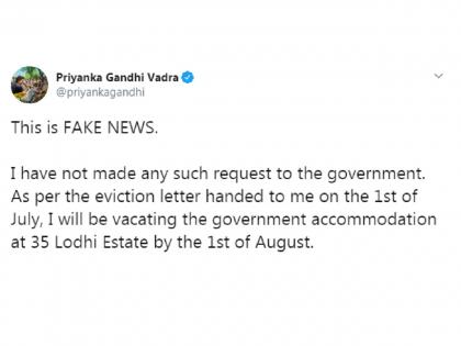 पुढील काही दिवस आपल्याला बंगल्यात राहण्याची परवानगी देण्यात यावी अशी विनंती प्रियंका यांनी पंतप्रधान नरेंद्र मोदी यांच्याकडे केल्याचं वृत्त काही ठिकाणी प्रसिद्ध झालं होतं. मात्र यावर आता स्वत: प्रियंका गांधी यांनी स्पष्टीकरण दिलं असून हे वृत्त फेटाळून लावलं आहे. अशी कोणतीही मागणी आपण केली नसल्याचंही त्यांनी स्पष्टपणे सांगितलं आहे. आपल्या ट्विटर अकाऊंटवरून प्रियंका गांधी यांनी याबाबतचे ट्विट केले आहे.