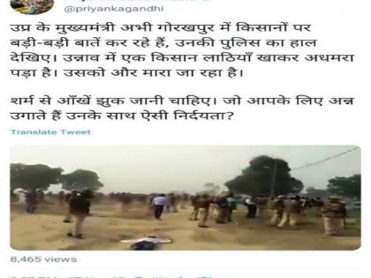 प्रियांका यांनी यावर मुख्यमंत्री आताच गोरखपूरमध्ये शेतकऱ्यांबाबत मोठे मोठे भाषण देत आहेत. तर उन्नाव मध्ये त्यांचेच पोलिस शेतकऱ्यांवर लाठीचार्ज करत आहेत. एक शेतकरी अर्धमेल्या अवस्थेत पडला आहे. त्याला आणखी मारले जात आहे, असे ट्विट केले. यावर उन्नाव पोलिसांनीच तो व्हिडिओ पोस्ट करत उत्तर दिले आहे. या व्हिडिओमध्ये हा तरुण शेतकरी पोलिसांच्या लाठ्या वाचविण्यासाठीच असा पडला होता. पोलिस पुढे जाताच त्याने उठत धूम ठोकल्याचे दिसत आहे. हा व्हिडिओ व्हायरल झाल्यावर प्रियंका गांधींना नेटकऱ्यांनी ट्रोल करण्यास सुरूवात केली. हे कळताच गांधी यांना हे ट्विट डिलिट करावे लागले.