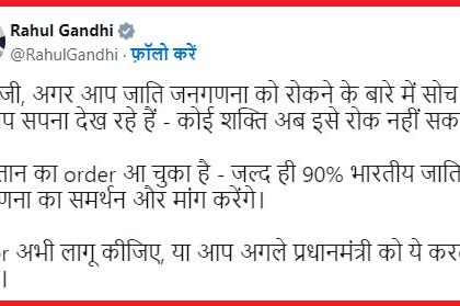 एका हिंदी मीडिया हाउसने जात जणगणनेबाबत लोकांची मते जाणून घेण्यासाठी एक सर्वेक्षण केले, ज्यात बहुतांश लोकांनी जात जणगणनेची मागणी केल्याचे समोर आले आहे. यावरुन राहुल गांधी सोशल मीडिया प्लॅटफॉर्म 'X' वर म्हणाले की, 'मोदीजी, तुम्ही जात जनगणना थांबवण्याचा विचार करत असाल, तर तुम्ही स्वप्न पाहत आहात. आता कोणतीही शक्ती जात जणगणना थांबवू शकत नाही. भारताचा आदेश आला आहे, लवकरच 90% भारतीय जात जनगणनेला पाठिंबा देतील आणि मागणी करतील. आताच आदेशाची अंमलबजावणी करा, नाहीतर पुढचे पंतप्रधान हे करताना दिसतील,' अशी बोचरी टीका त्यांनी आपल्या पोस्टमधून केली.