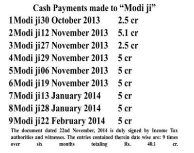 2012-13 मध्ये आयकर खात्याने टाकलेल्या धाडीमध्ये आदित्य बिर्ला समूहातील अधिका-यांच्या डाय-या, लॅपटॉप आदी जप्त करण्यात आले होते. यामध्ये गुजरात मुख्यमंत्री या नावाने 25 कोटी रुपयांची नोंद आढळली होती. याचा आधार घेत अरविंद केजरीवाल व प्रशांत भूषण यांनी मोदींविरोधात झोड उठवली होती. तसेच सुप्रीम कोर्टातही धाव घेतली होती. मात्र सर्वोच्च न्यायालयाने हा पुरेसा पुरावा नसल्याचे सांगत कारवाईस नकार दिला होता.