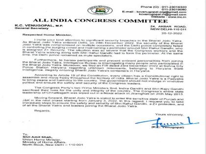भारत जोडो यात्रेत राहुल गांधी यांच्या सुरक्षेत त्रुटी संदर्भात काँग्रेसचे सरचिटणीस केसी वेणुगोपाल यांनी अमित शहा यांना पत्र लिहिले आहे. 24 डिसेंबर रोजी दिल्लीतील भारत जोडो यात्रेदरम्यान अनेक ठिकाणी राहुल गांधींच्या सुरक्षेबाबत निष्काळजीपणा करण्यात आला आहे.