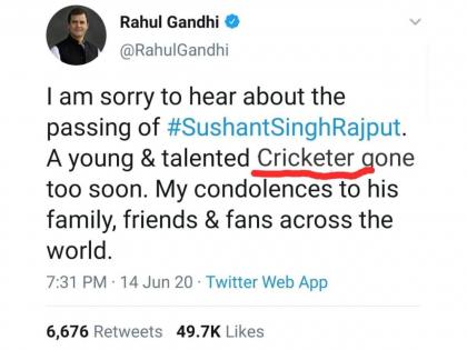 सिनेसृष्टीतील कलाकारांसह, क्रीडा आणि राजकीय क्षेत्रातील मंडळींनीही सुशांतच्या आत्महत्येनंतर आपल्या भावना व्यक्त केल्या. काँग्रेसचे माजी अध्यक्ष राहुल गांधी यांनी ही शोक व्यक्त करण्यासाठी एक ट्विट केलं होतं. राहुल गांधींचं ते ट्विट सोशल मीडियावर जोरदार व्हायरल होत आहे. कारण यामध्ये एक चूक असल्याचं म्हटलं आहे. सुशांतचा उल्लेख हा अॅक्टर ऐवजी क्रिकेटर असा करण्यात आल्याचं दिसत आहे. या ट्विटमधील चूक पाहून अनेकजण संतापले आहेत. मात्र हे ट्विट खरं आहे का?, राहुल गांधींनी खरंच सुशांतचा उल्लेख क्रिकेटर असा केला आहे का? हे जाणून घेण्यासाठी या व्हायरल पोस्टमागचं सत्य शोधण्यात आलं.